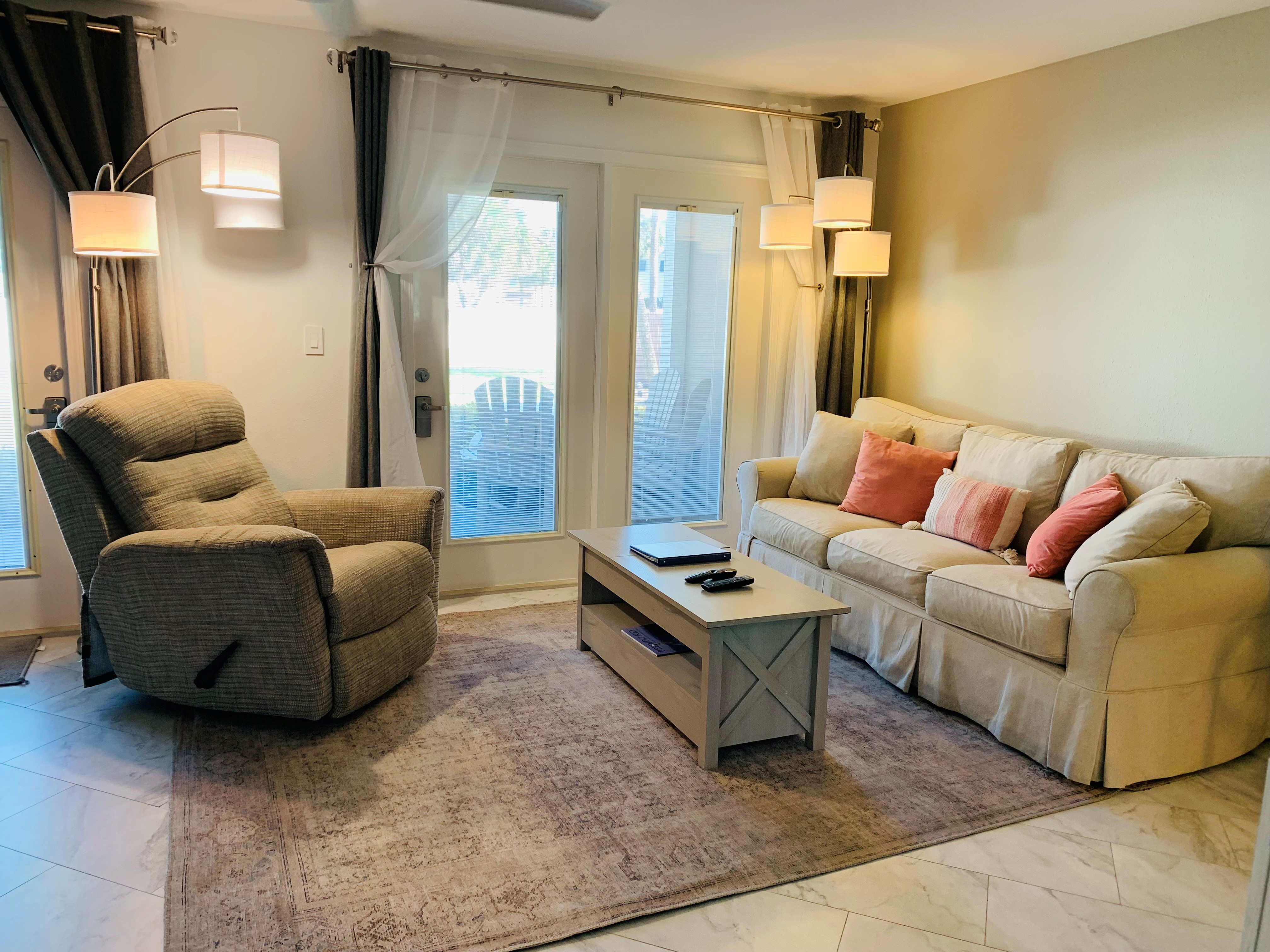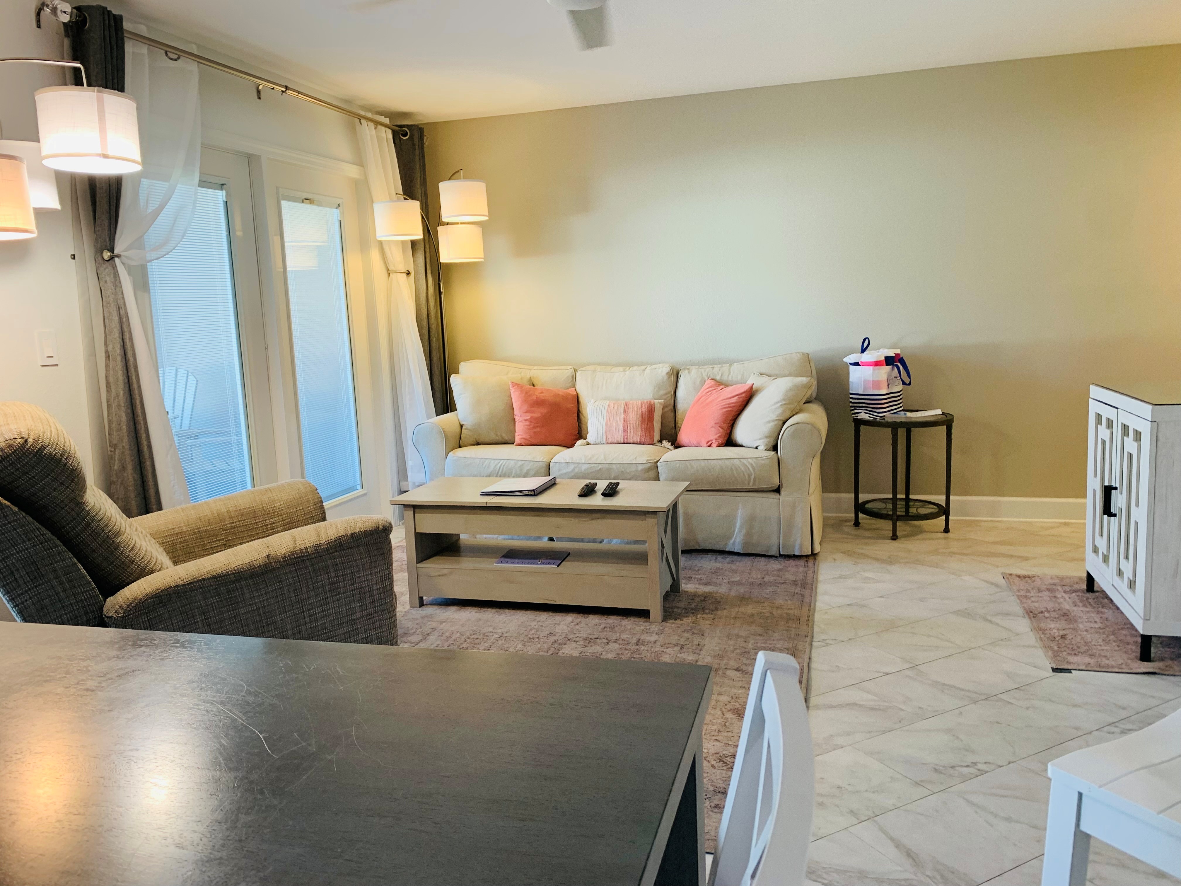 The living room with a dining table, bar, and large flat screen TV does include a sofa sleeper. The kitchen is new, functional, and fully stocked. The kitchen has plenty of storage and space with surrounding ceiling-to-floor cabinets. The condo includes a large private patio with new outdoor furniture and plenty of room for family and friends. You are shore to love all that this condo has to offer.